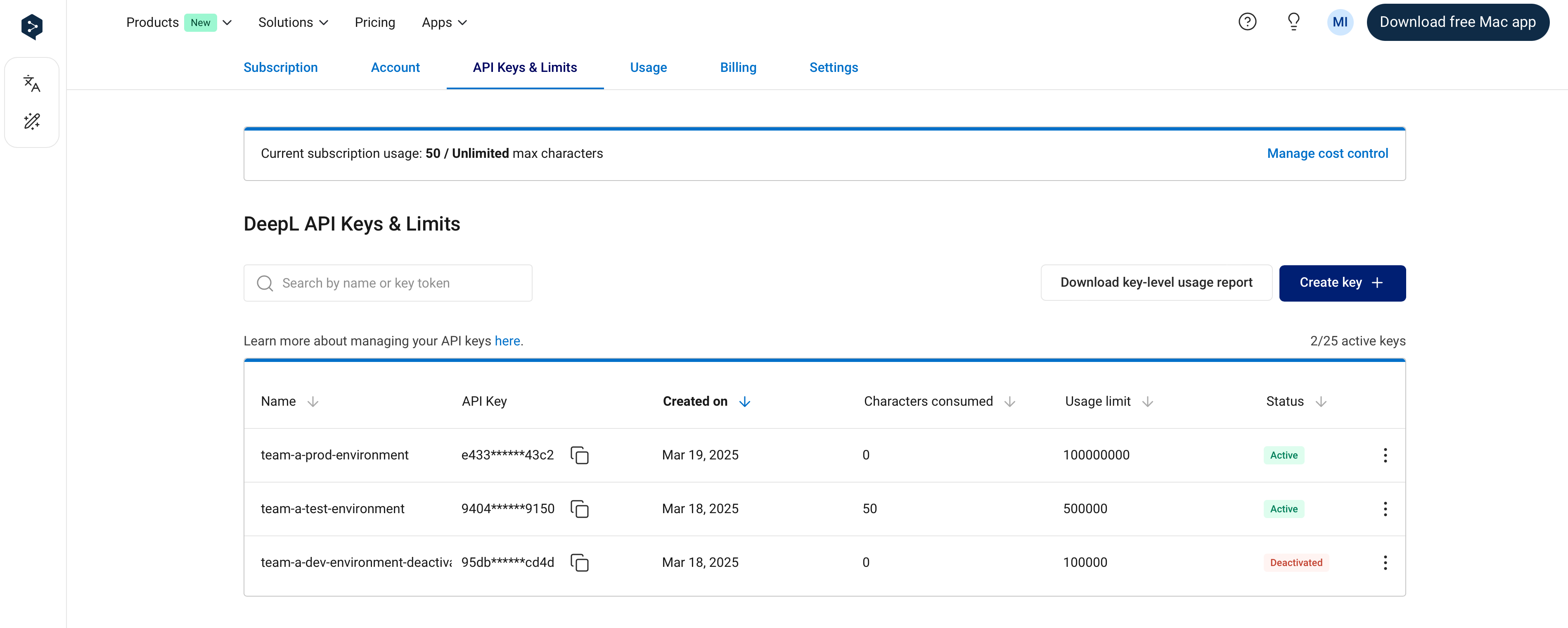 You can find and manage your API keys in the “API Keys & Limits” tab when signed into your DeepL API account. It’s possible to create multiple, simultaneously active API keys in a single API subscription.